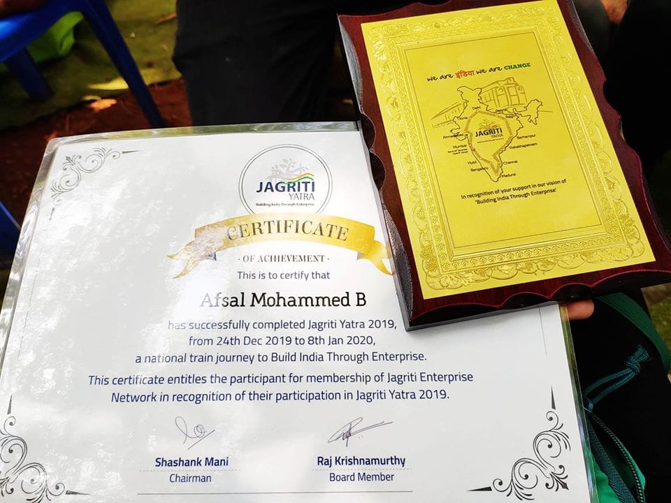In 2019, Afsal was selected as a participant of the Jagriti Yatra, a nationwide entrepreneurship and leadership journey across India, further strengthening his understanding of grassroots leadership, social entrepreneurship, and systemic change.