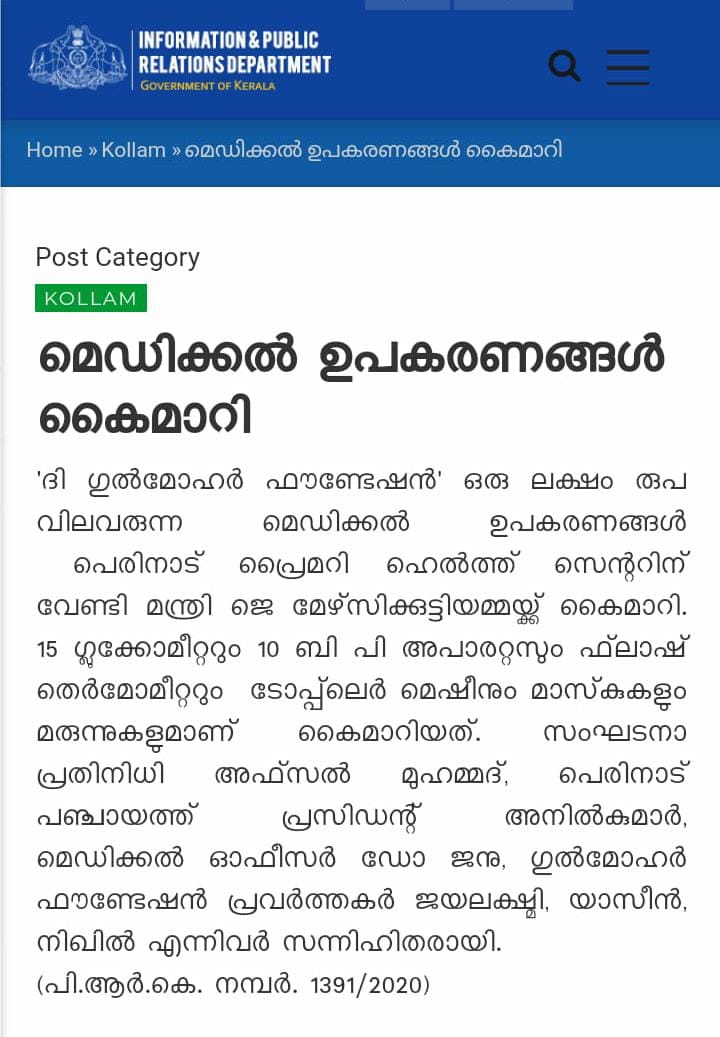 - Memeber of Palliative Monitor Committee, Perinad Gramapanchyat